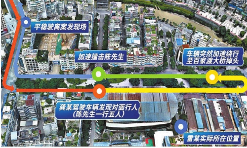 龚某随即驾车折返,行至事发的丁字路口附近时,因夜色昏暗,误将在对向人行横道上行走的陈先生认作雷某,遂猛踩油门,高速径直冲向陈先生……