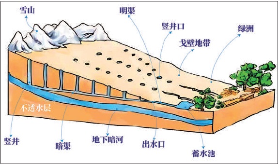 坎儿井,早在《史记》中就有记载,时称“井渠”,是荒漠地区一种特殊灌溉系统,主要是截取地下潜水用于农田灌溉和居民用水。