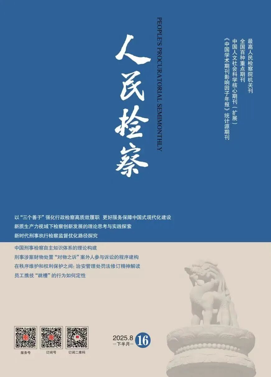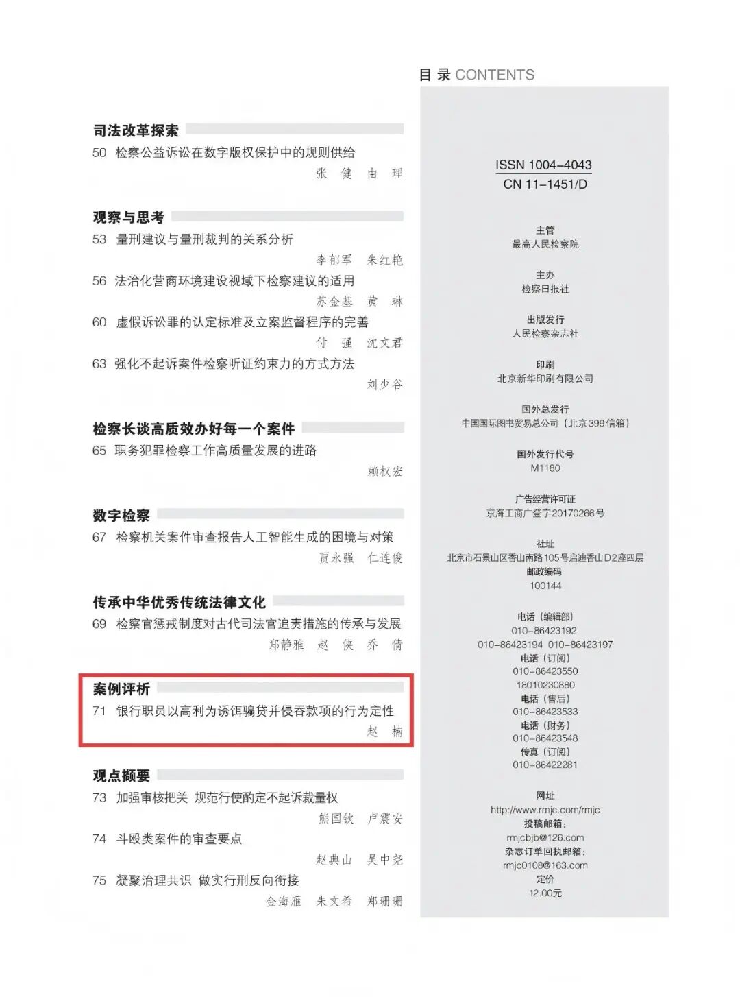 近日,由武川县检察院党组副书记、副检察长赵楠撰写的刑民交叉案件案例评析《银行职员以高利为诱饵骗贷并侵吞款项的行为定性研究》,在最高人民检察机关刊物《人民检察》(2025年第16期)刊发。