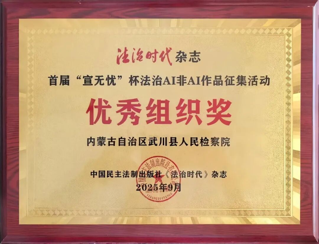 活动中,发布了首届“宣无忧”杯法治AI和非AI作品征集入选作品名单,武川县检察院选送的两件普法作品分别荣获普法图片类三等奖和普法视频类优秀奖,同时还获得优秀组织奖。