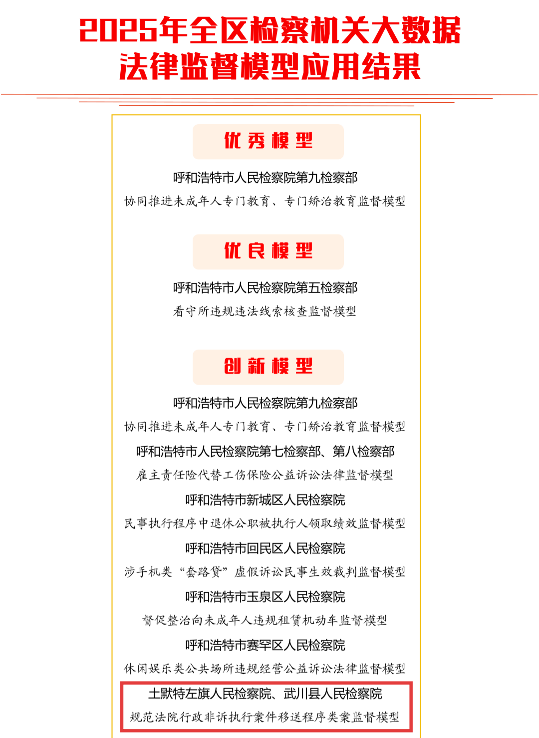 近日,自治区检察院通报2025年全区大数据法律模型应用情况,武川县检察院与土默特左旗检察院共同研发的“规范法院行政非诉执行案件移送程序类案监督模型”,荣获“全区创新模型奖”。