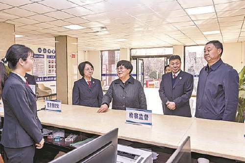 日前,马红丽代表(左三)在大荔县综治中心服务大厅检察监督窗口了解接访情况。