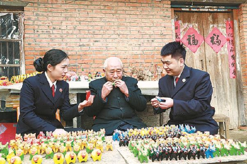 一月五日,淮滨县检察院检察官到三空桥乡肖营村回访“泥叫吹”非遗传承人郑保民(中)。